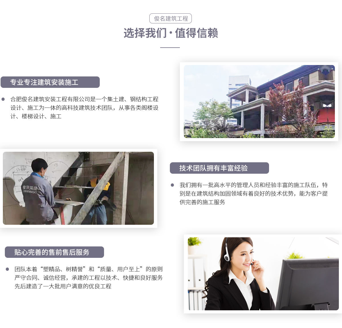 - 合肥俊名建筑安裝工程有限公司是一個集土建、鋼結構工程設計、施工為一體的高科技建筑技術團隊,從事各類閣樓設計、施工。我們擁有一批高水平的管理人員和經驗豐富的施工隊伍,特別是在建筑結構加固領域有著良好的技術優勢。團隊員工精誠團結,以“尊重規范,拒絕平凡”為宗旨,為客戶提供完善的施工服務。團隊本著“塑精品、樹精譽”和“質量、用戶至上”的原則,嚴守合同、誠信經營,所...